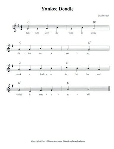 AllInOne Piano Primer Book for the Young Beginner;Yankee Doodle Full Version Yankee Doodle went to town Ariding on a pony, Stuck a feather in his cap And called it macaroni' Chorus Yankee Doodle keep it up, Yankee Doodle dandy, Mind the music and the step, And with the girls be handy Fath'r and I went down to camp, Along with Captain Gooding, And there we saw the men and boys As thick asThen this free printable music sheet is a MUST!